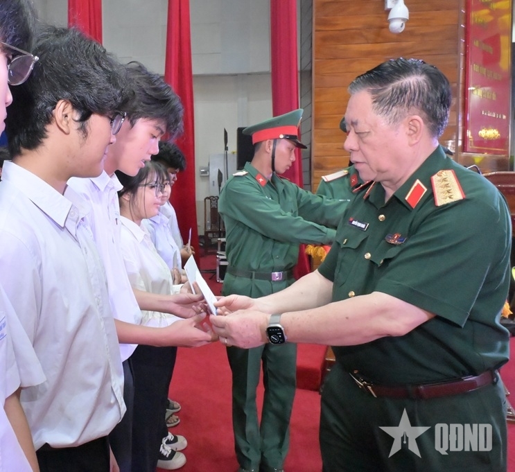 Gen. Nghia and leaders of Dong Thap province present gifts to local disadvantaged students with excellent academic results. |