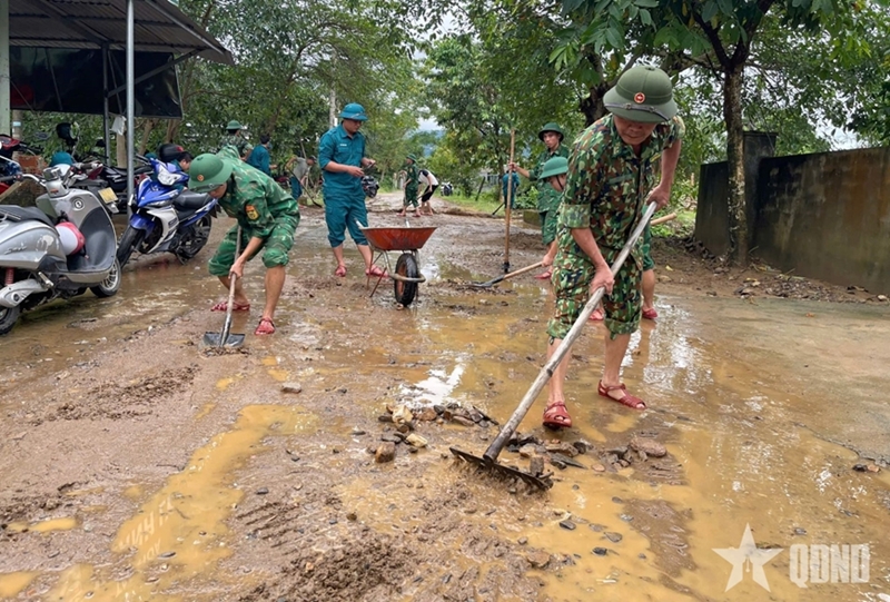 Officers and soldiers from Hai Van Border Post and Hai Van Ward Military Command do the cleanup after the floods. |