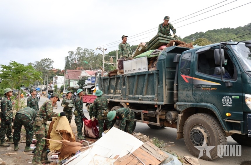 Officers and soldiers of Division 302 assist D’ran commune with environmental sanitation after the flood. |