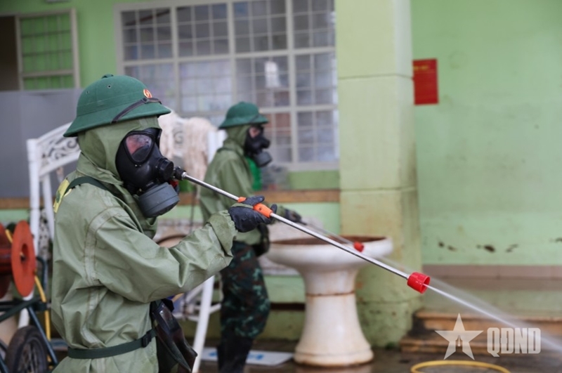 Chemical troops conduct disinfection and decontamination operations in D’ran commune. |