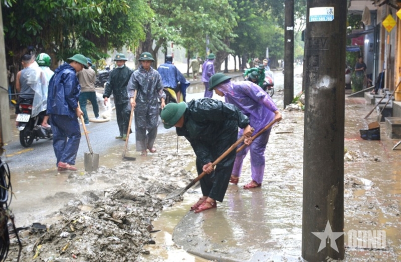 Early Sunday morning, the city was still damp after days under floodwater. By 4 a.m., troops had already been awake and preparing tools and supplies. At 6 a.m., working teams set out in different directions. While major streets were mostly cleared, alleys and low-lying areas remained full of mud and debris. On Ung Binh street, Vy Da ward, soldiers tirelessly shoveled thick layers of mud and waste despite the stench.
