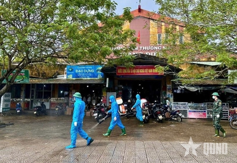 Hue CDC’s staff disinfect the environment at Quang Dien Trade Center. |