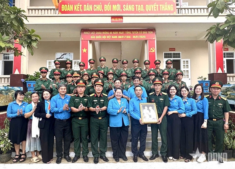 The Ho Chi Minh City Labor Federation delegation presents gifts to officers and soldiers of Artillery Company 10. |