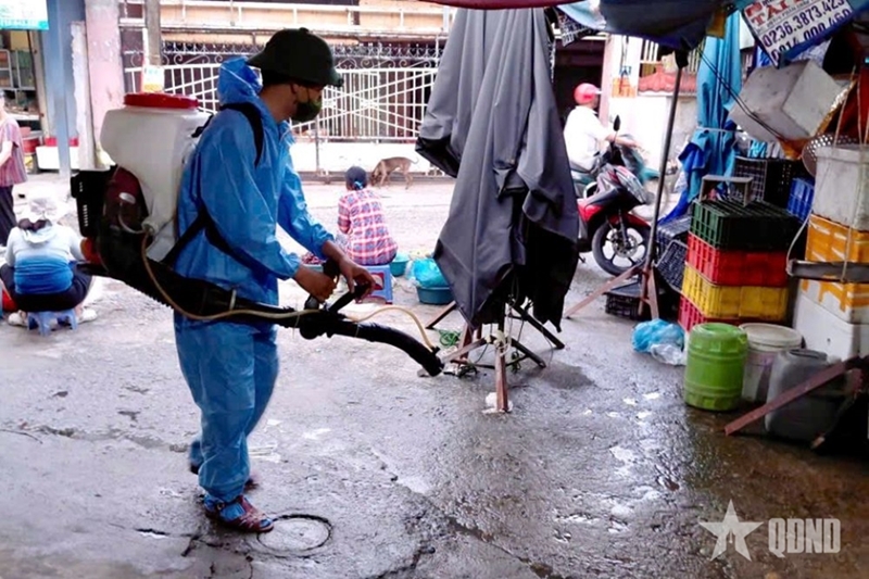 Troops from Lang Co Border Post disinfect Lang Co market in Chan May - Lang Co commune. |