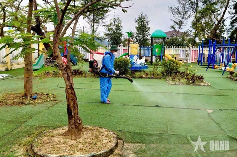 Troops from the Border Post of Chan May Port Border Gate disinfect Loc Tien Secondary School in Chan May - Lang Co commune. |