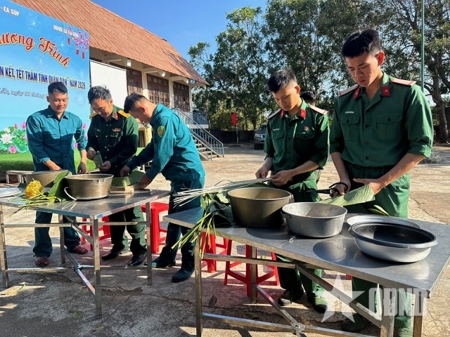 On February 8, the grounds of the Ba Na Hamlet Community Cultural House became lively with the competition “Green Banh Chung (Square Glutinous Rice Cake) Festival,” attracting officers and soldiers, together with militia personnel and Youth Union members of the commune and hamlet. Hands once familiar with weapons now showed surprising dexterity in crafting square, vibrant green banh chung.