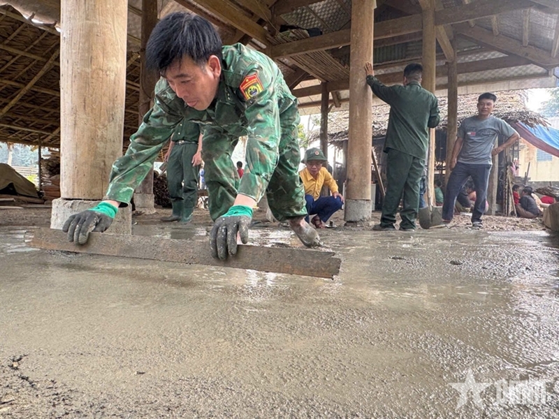 Early one weekend, personnel from Mon Son Border Post, local authorities, and villagers collaborated to pour a concrete floor for Luong Van Suu’s house in Bung village. Despite the summer heat and steep terrain, the team worked efficiently to complete the task.