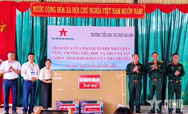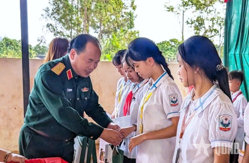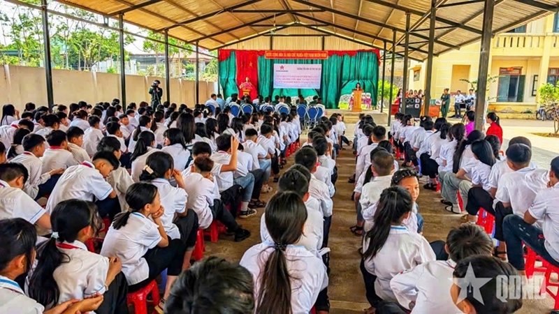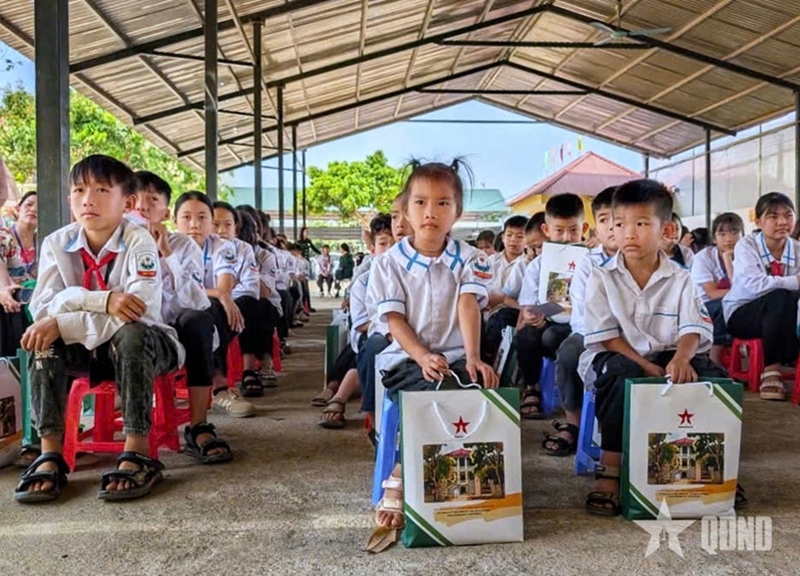Major General Doan Xuan Bo presents gifts to students and Na San Primary and Secondary School. |