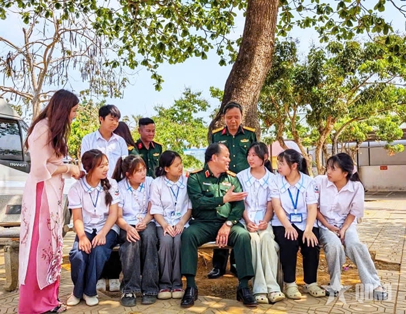 Major General Doan Xuan Bo talks with students. |