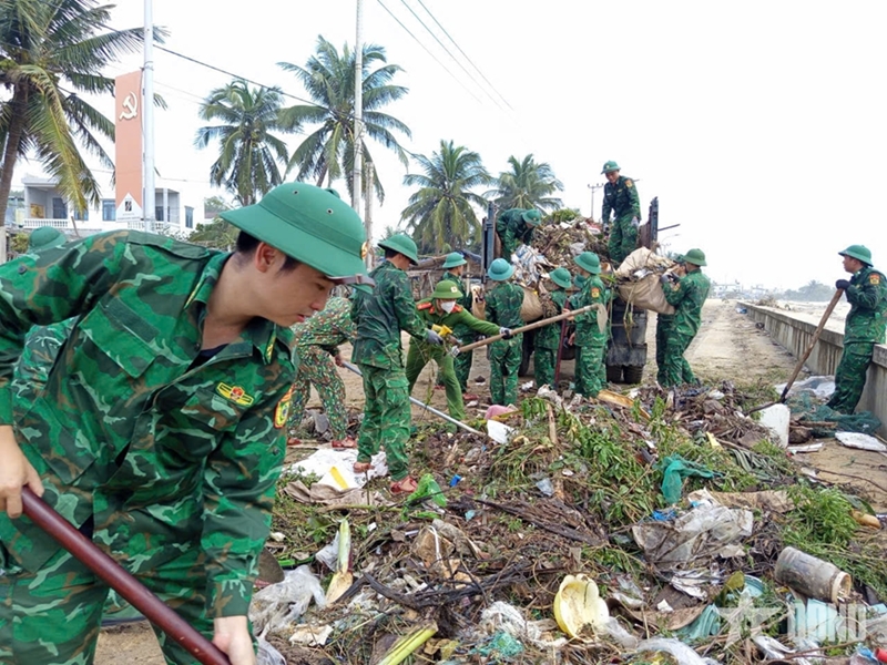 Officers and soldiers from the Border Guard Command of the Quang Ngai Provincial Military Command and Sa Huynh Border Post collect debris and clear coastal roads after the storm. |