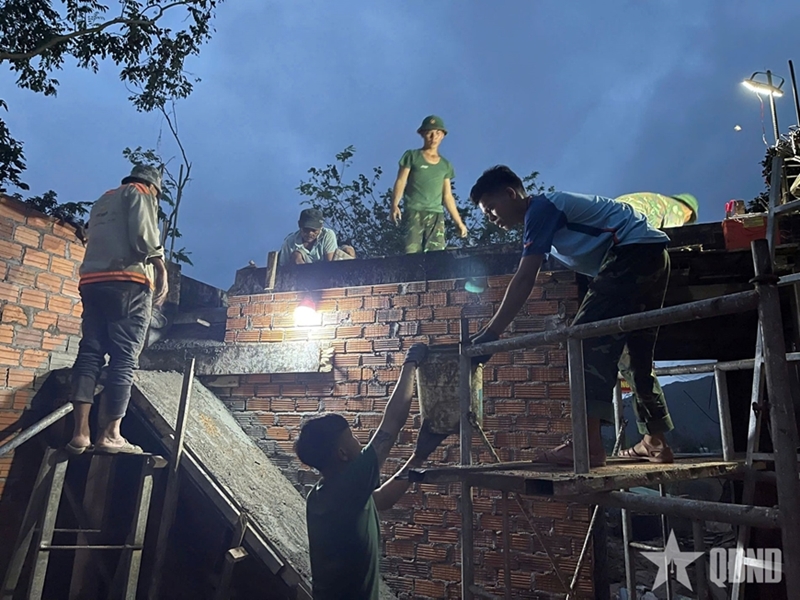 After just 13 days, the house, with a structural area of 32.4 square meters, had its walls completed and a 13.5-square-meter flood-resistant mezzanine poured, creating favorable conditions for subsequent construction stages to proceed on schedule. Similar scenes can be found at the construction sites for the houses of Phan Thi Mang, Ha Thi Nhung, and Luong Thi Nom, where the image of soldiers has become familiar to local residents.