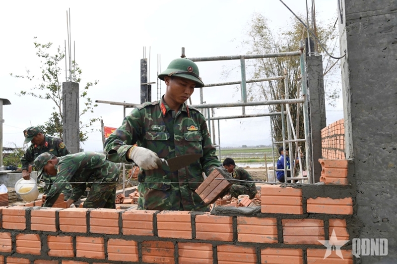 One of the first projects to break ground was the house of Nguyen Thi Ngoc Thao in Nam Binh 2 Residential Area. Due to narrow access roads, construction vehicles could not reach the site, requiring soldiers to manually transport every sack of cement, steel bar, and brick. Throughout the construction process, the troops worked continuously from early morning until late afternoon, making full use of favorable weather conditions to accelerate progress.