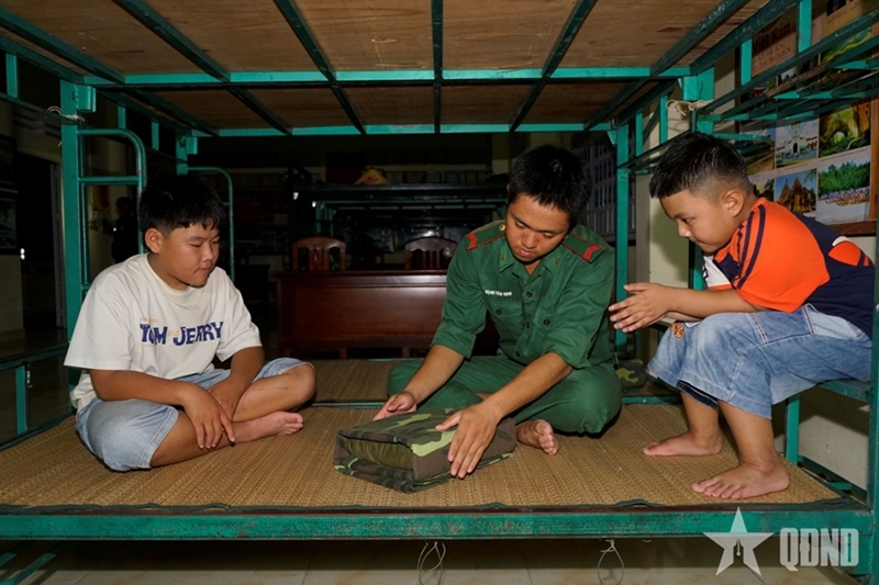 A border guard soldier teaches local children how to fold blankets and mosquito nets. |