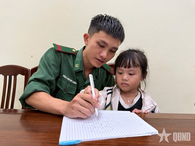 Private First Class Phan Huynh Luan teaches a young girl how to draw flowers. |