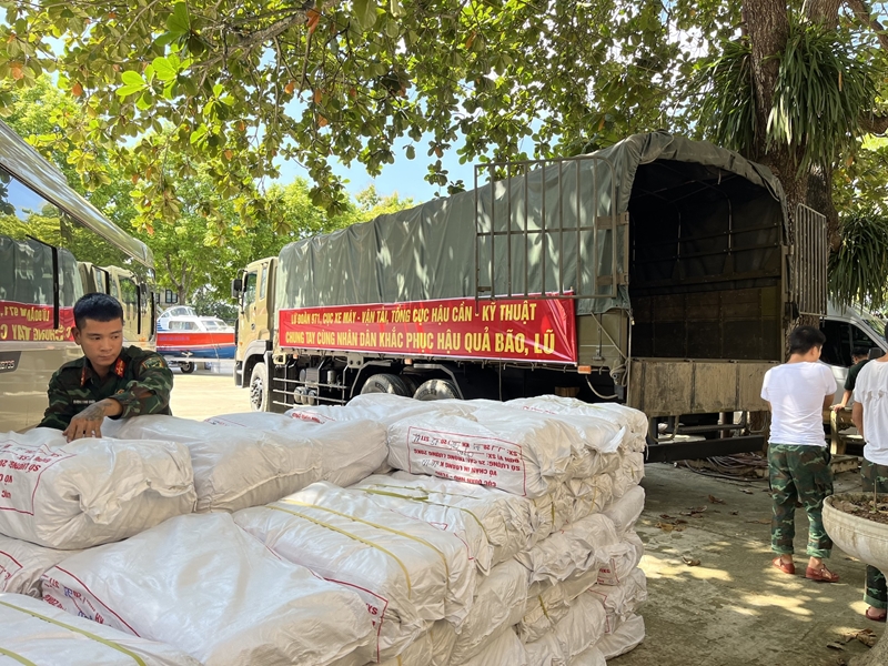 The Command of the Defensive-area Region 3 – Nhan Ly (the Lang Son Provincial Military Command) receives relief goods from the General Department of Logistics and Technical Services for flood victims. |