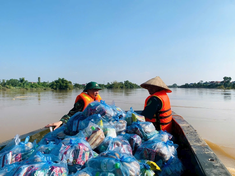 Troops of the Thai Nguyen Provincial Military Command deliver relief goods by boat to isolated areas. |