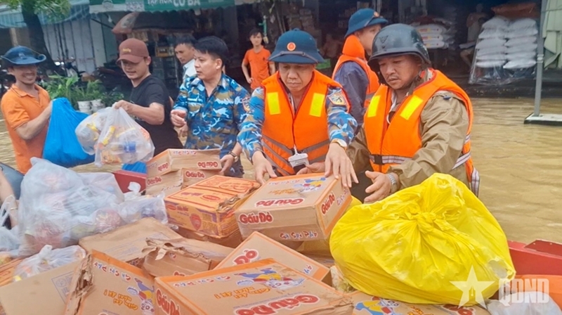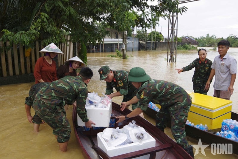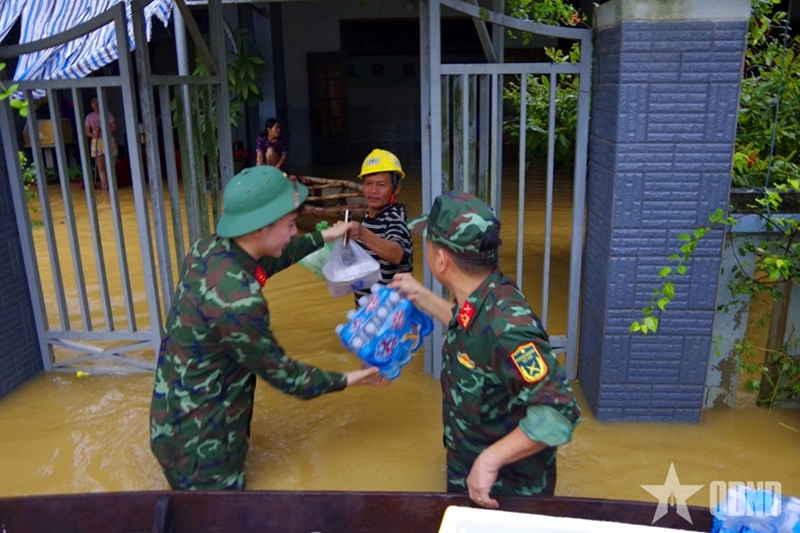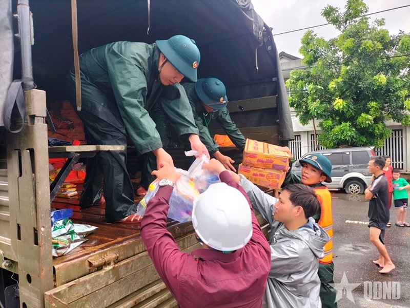 The troops, in coordination with local authorities and border guards of Da Nang City, transported over two tons of relief goods, including drinking water, milk, instant noodles, bread, life jackets, and flashlights, to severely flooded areas in Viem Tay 1 village, Dien Ban Bac ward.