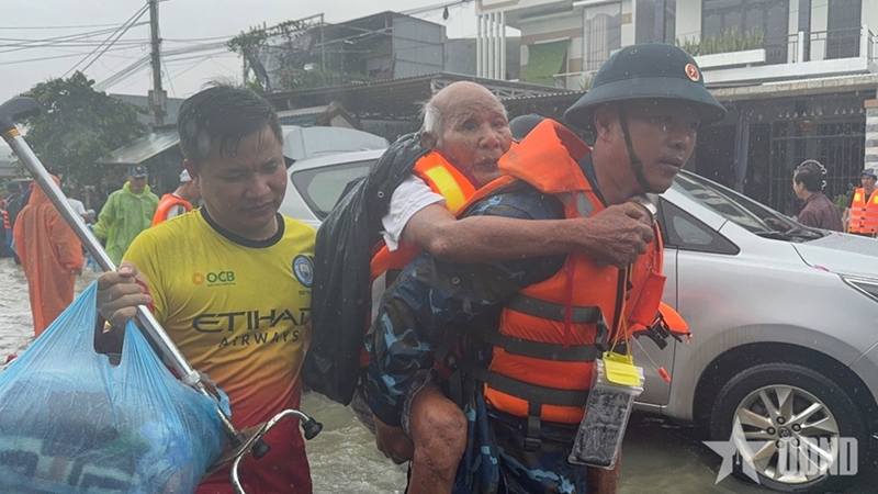 | Evacuating elderly Tran Viet Ne from a flooded danger area in Dien Ban Dong ward to safer place |