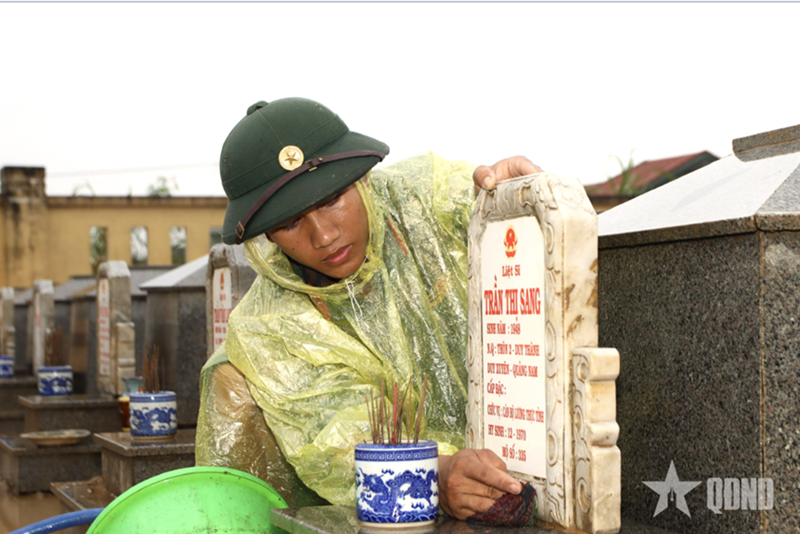 After days of flooding, many cemeteries in Da Nang and Quang Ngai were buried under mud and debris. On the afternoon of November 1, at Duy Nghia War Cemetery in Da Nang, under the command of Senior Captain Vo Thanh Ly, Head of Company 7, Battalion 2, Regiment 143, Division 315 of Military Region 5, young soldiers carefully cleaned and polished each grave, restoring dignity and respect to the resting places of fallen heroes.