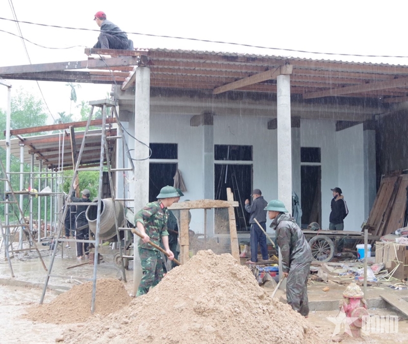 Officers and soldiers of the Hue Municipal Military Command assist residents in building houses in Khe Tre commune. |