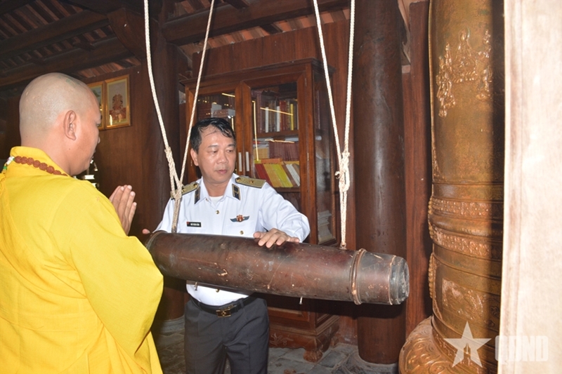 Rear Admiral Ngo Thanh Cong, Director of the Vietnam Naval Academy, strikes the bell at the pagoda on Song Tu Tay Island. |