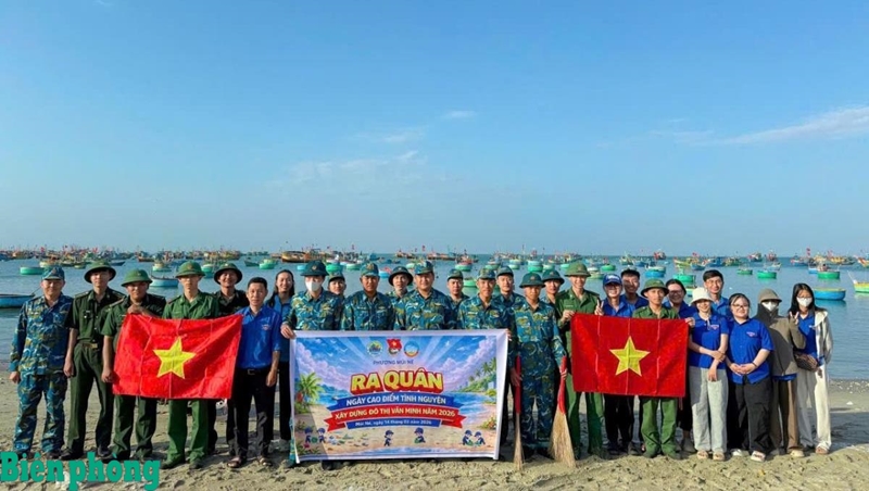 Officers and Youth Union members of Mui Ne Border Post under the Lam Dong provincial Border Guard Command join forces with Mui Ne ward Youth Union Organization and Regiment 920 to launch the peak volunteer day 2026 for civilized urban area at Mui Ne fishing village. |