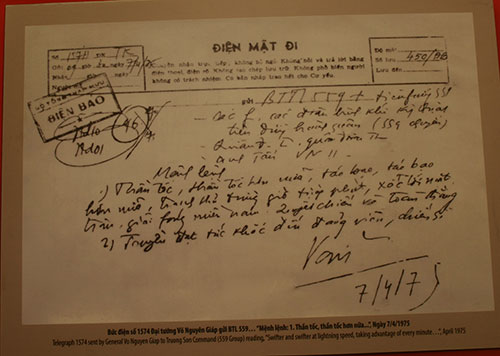 | Telegram 1574 General Vo Nguyen Giap sent to the Command of the Combat Group 559, urging faster operations to liberate the south, April 7th 1975. |