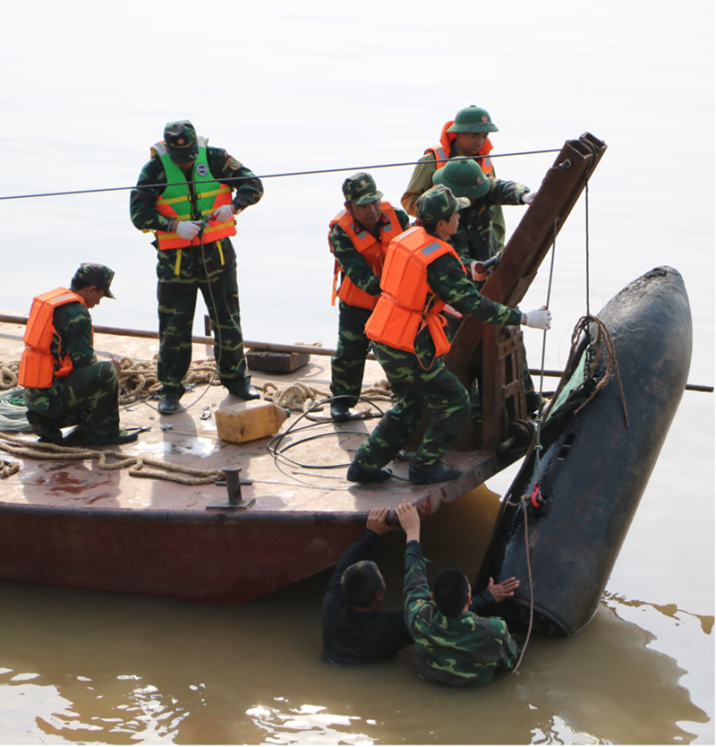 Engineers retrieving a large bomb from the riverbed near Long Bien Bridge, Hanoi |