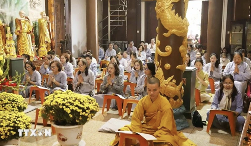 Vietnamese Buddhists and expatriates at Phat Tich Pagoda in Vientiane |