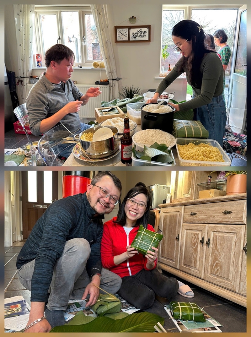 To have a green "banh chung" (square glutinous rice cake) in a foreign land is a journey filled with effort and longing. Nguyen Dang Khanh, currently residing in Bristol, shared that the difficulty lies not only in arranging time since everyone has different schedules and routines, but also in finding a space large enough to recreate the Tet atmosphere.