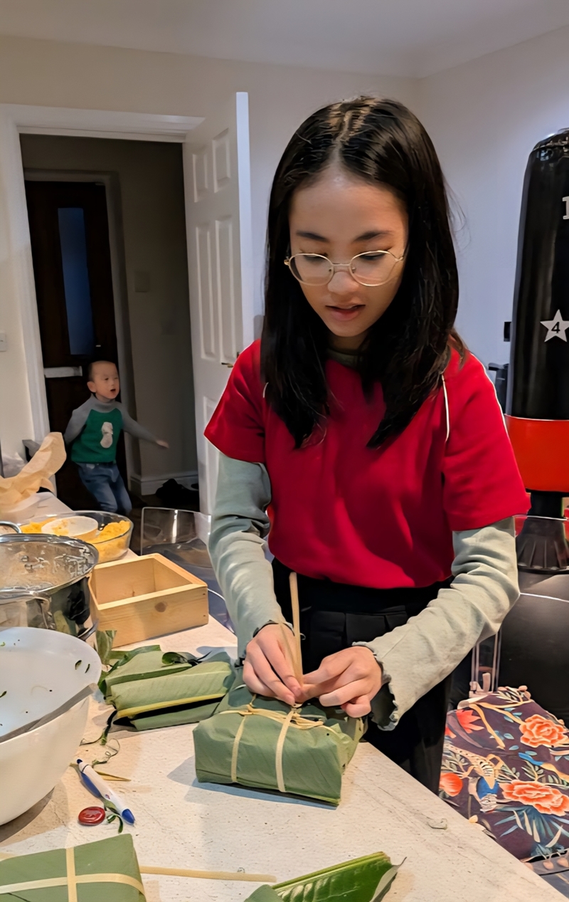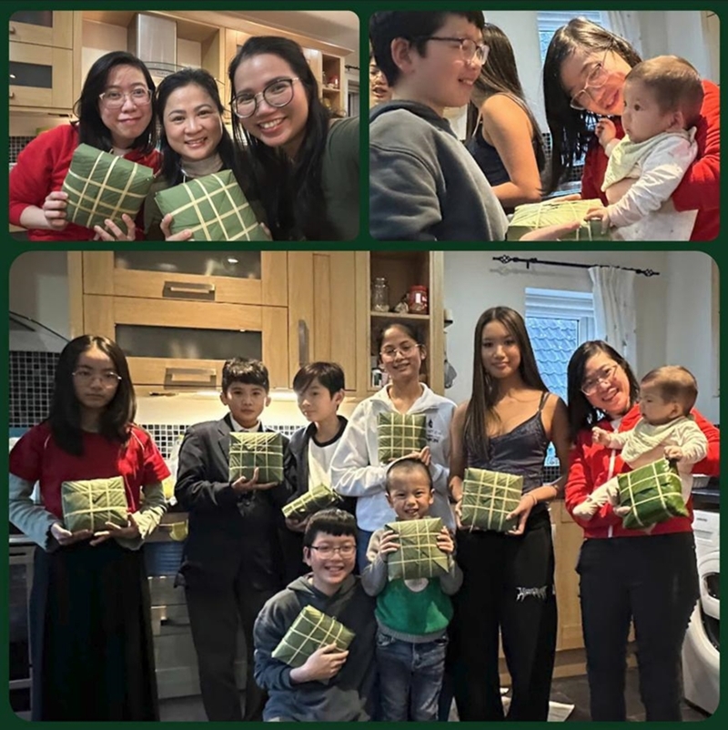 Nguyen Ngoc Mai from Cheltenham shared, “Tet is a moment of reunion with loved ones, and "banh chung" is the soul of Tet.” She recalled watching her grandparents and parents make cakes every Tet when she was in Vietnam. Now, in this foggy land, she wraps the cakes herself, experiencing the festive atmosphere from washing leaves and splitting bamboo strings to lighting the fire, chatting around the pot, and laughing with friends.