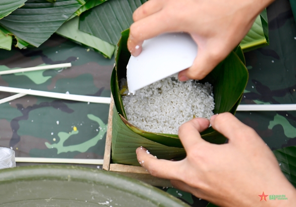 Below are photos showing the vibrant atmosphere of the Banh chung making contest among officers, soldiers, and Youth Union members of Brigade 144.