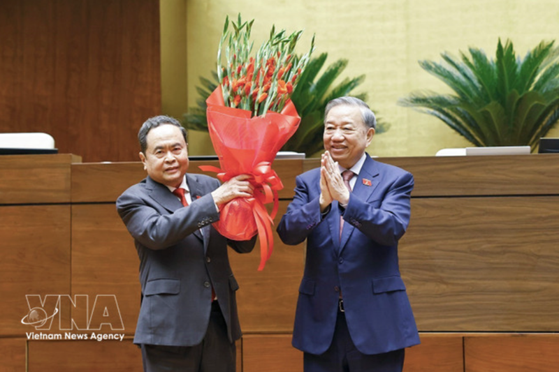 Party General Secretary To Lam (right) presents congratulatory flowers to N.A. Chairman Tran Thanh Man. |