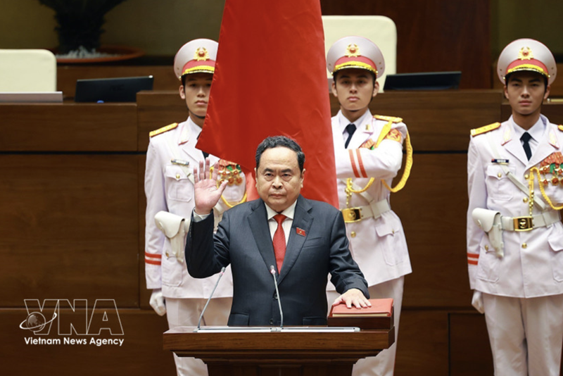Following the vote, N.A. Chairman Man took the oath of office. Under the national flag, before the N.A. and voters nationwide, he pledged absolute loyalty to the Fatherland, the people and the Constitution of the Socialist Republic of Vietnam, and committed to fulfilling the duties entrusted by the Party, State and people.