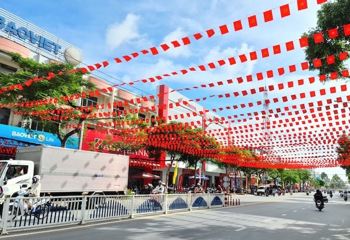 A section of Nguyen Hue Street in Cao Lanh ward, Dong Thap province decorated in celebration of the 14th National Party Congress (Photo: dongthap.gov.vn) |