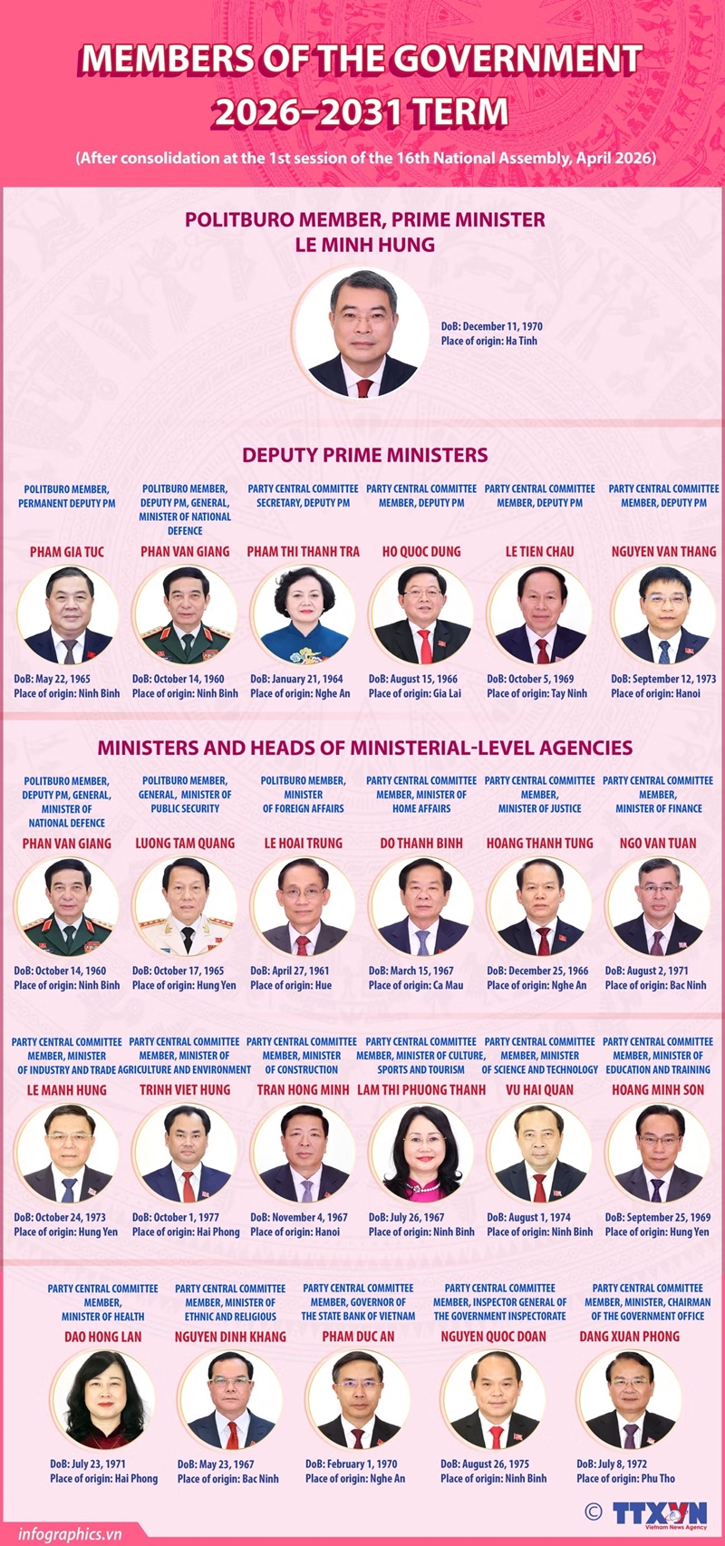 At its first session, the 16th National Assembly adopted a resolution electing Le Minh Hung, Politburo member, Secretary of the Party Central Committee and Chairman of the Party Central Committee’s Organization Commission, as Prime Minister of Vietnam. The National Assembly voted to approve the resolutions on the appointments of Deputy Prime Ministers, Ministers, and other members of the Government for the 2026-2031 term.