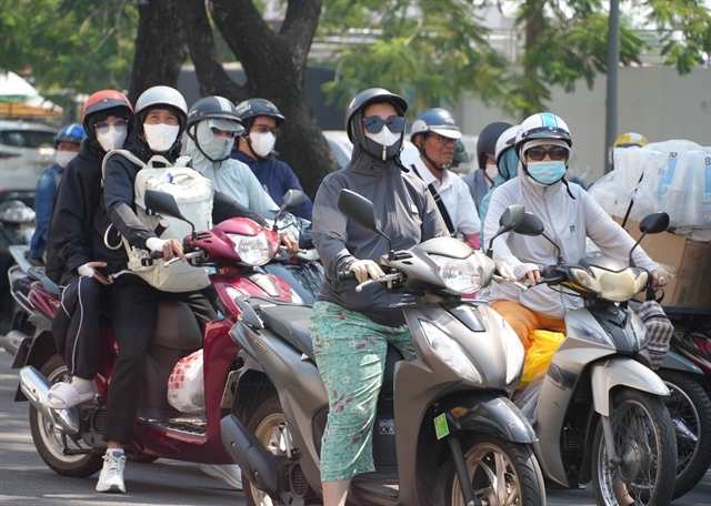 Motorbike riders in Hue City wear sun-protective gear as they travel along Tran Hung Dao Street amid the intense heatwave. |