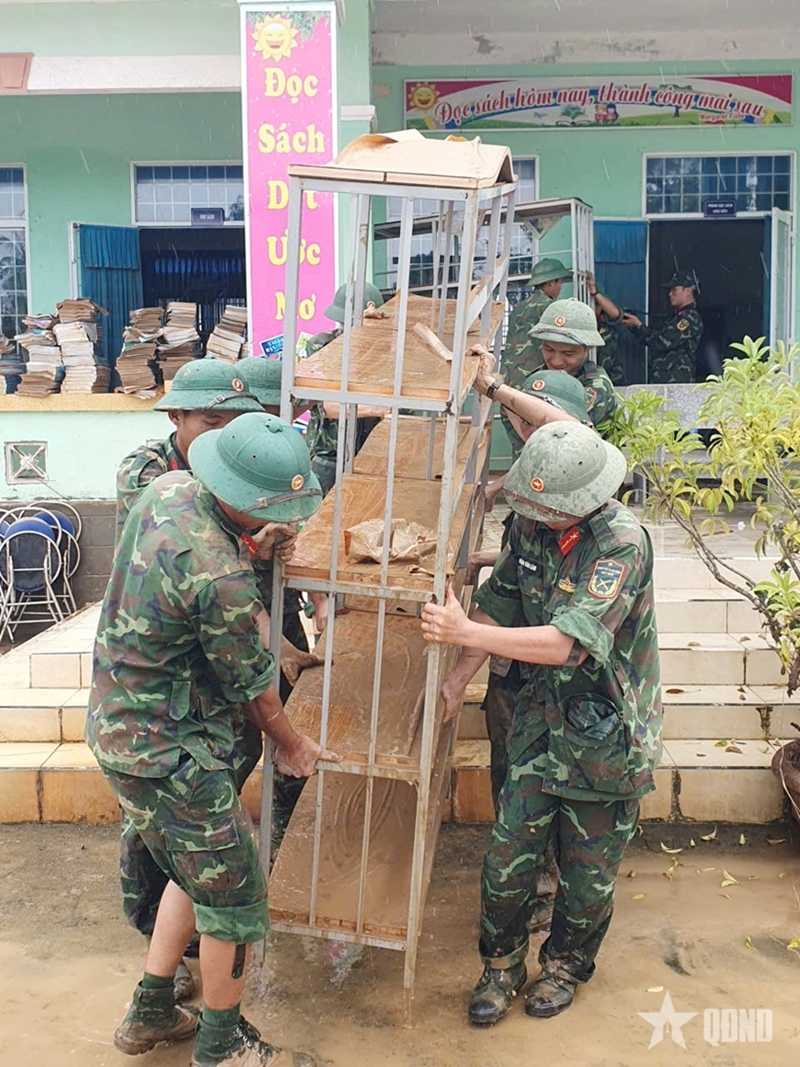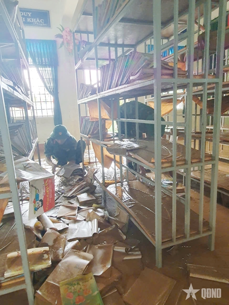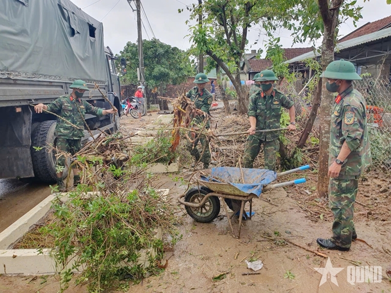 As floodwaters receded, Hoa Thinh resembled a battlefield. Troops from Military Region 5 promptly assisted in cleanup and recovery. Colonel Vo Duc Cuong, Second-in-Command of Division 315 under Military Region 5 said that the unit had deployed more than 200 personnel to clean schools, public offices, medical facilities, historical sites, and help villagers repair homes and roads.