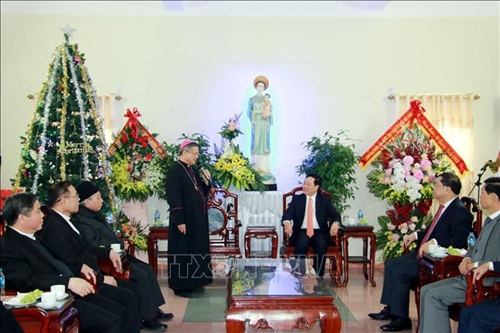 Permanent Deputy Prime Minister Pham Binh Minh visited and congratulated Archbishop Vu Dinh Hieu and Catholic dignitaries, priests and followers at Bui Chu Diocese in Xuan Truong district in the northern province of Nam Dinh on December 23, on the occasion of Christmas and New Year 2023.