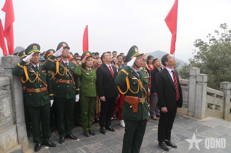 At Lung Cu National Flag Tower, Lung Cu Border Post, together with local Party committees, authorities, and residents of Lung Cu commune, organized a solemn flag-raising ceremony in a deeply moving atmosphere. From early morning, officers, soldiers, and local residents gathered in neat formation at the foot of the tower.