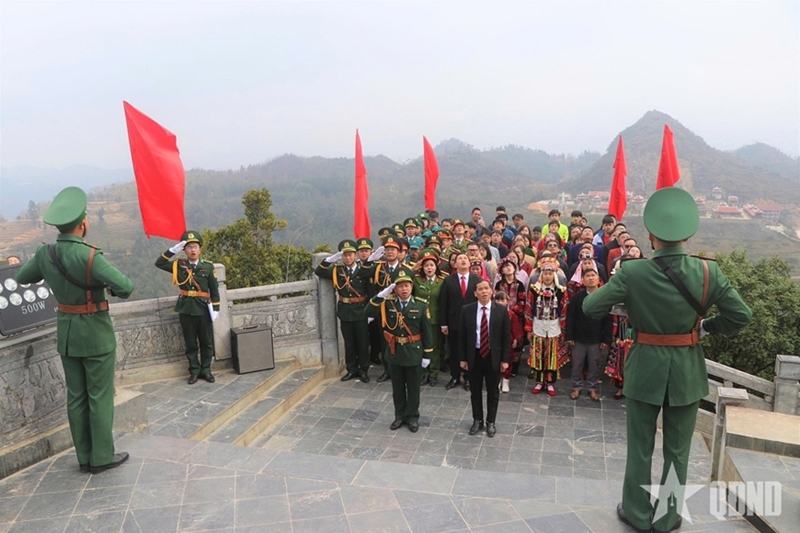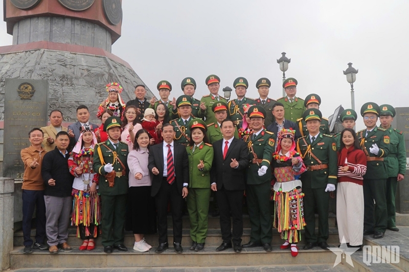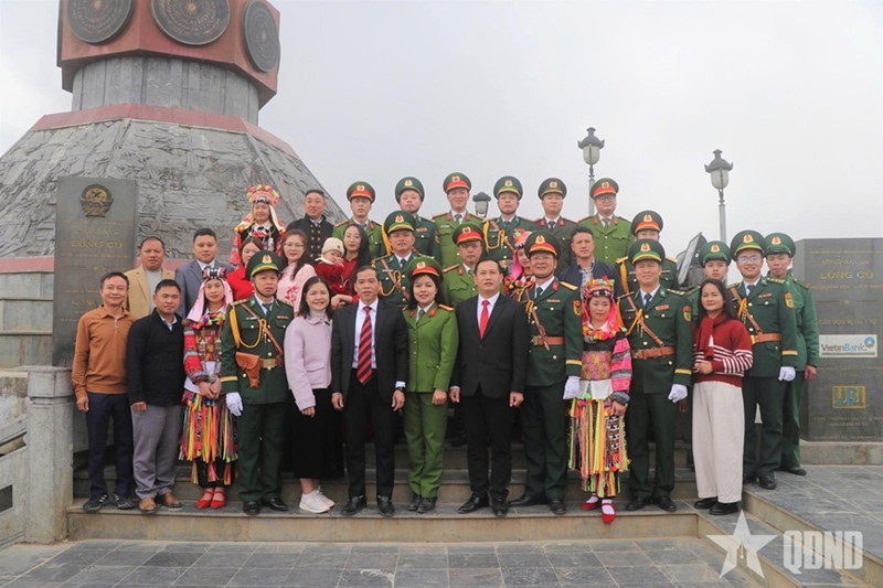 Officers and soldiers of Lung Cu Border Post, along with the Party organization, authorities, and residents of Lung Cu commune, take commemorative photos at Lung Cu National Flag Tower. |