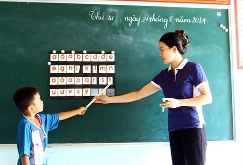 A teacher and a student in class at Thuong Hoa Primary and Secondary School in Minh Hoa district, in the Central coastal province of Quang Binh. |