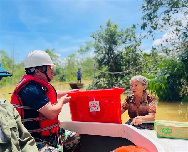A representative of the Vietnam Red Cross Society on October 2 delivers essential supplies to residents in the central province of Ha Tinh, the area hardest hit by Typhoon Bualoi. |