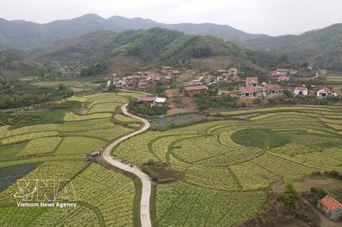 With its traditional "nha tuong trinh" (rammed earth houses) topped by yin-yang tiled roofs and the gentle melodies of sloong hao folk songs echoing through the hills, the village preserves the distinctive cultural identity of the Nung ethnic community.